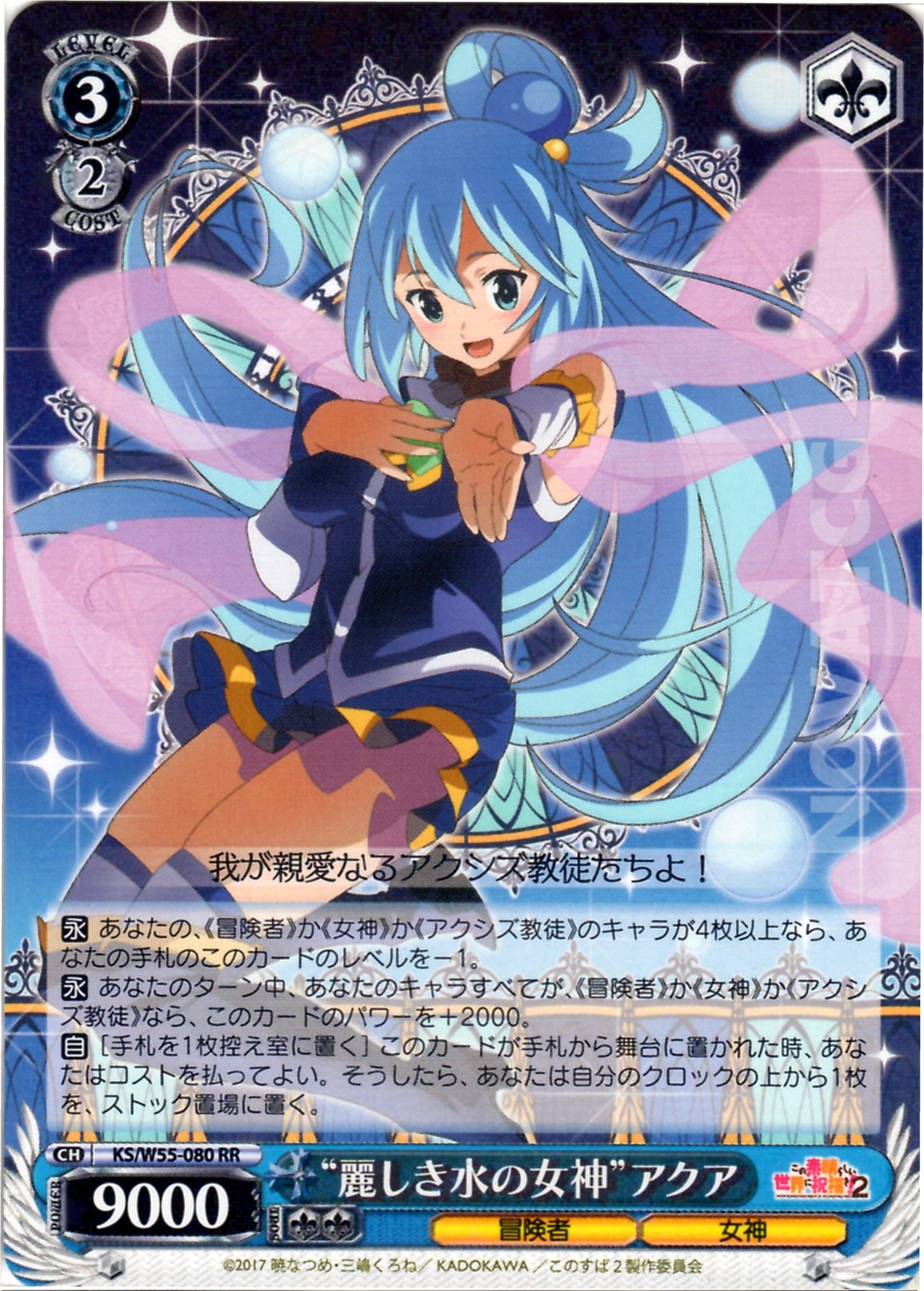 【永】 あなたのターン中、あなたのキャラすべてが、《冒険者》か《女神》か《アクシズ教徒》なら、このカードのパワーを+2000。