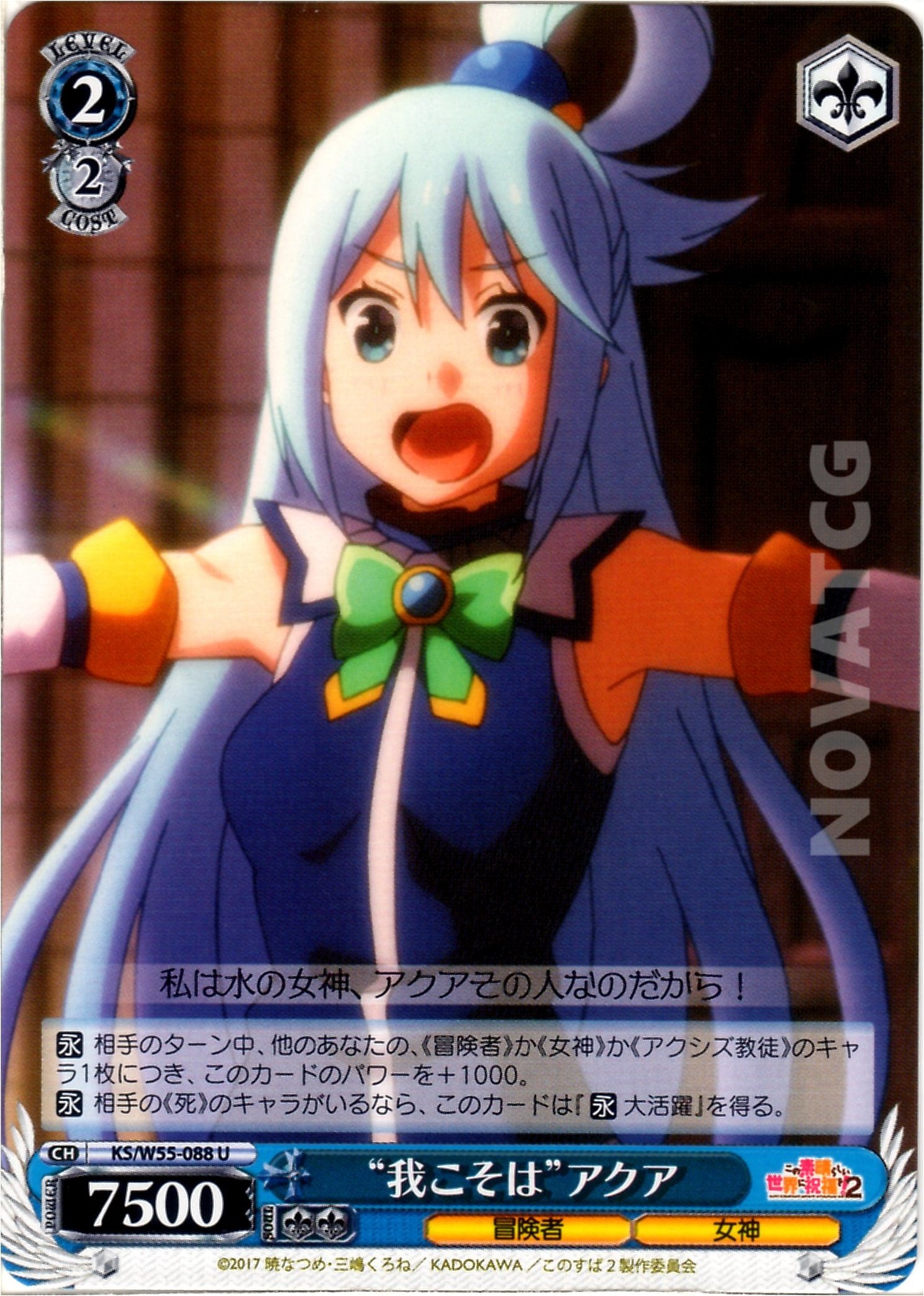 【永】 相手のターン中、他のあなたの、《冒険者》か《女神》か《アクシズ教徒》のキャラ1枚につき、このカードのパワーを+1000。