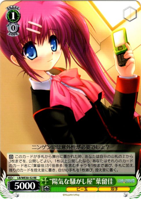 【自】 このカードが手札から舞台に置かれた時、あなたは自分の山札の上から3枚までを、公開してよい。1枚以上公開したなら、あなたはそれらのカードのカード名に「葉留佳」か「佳奈多」を含むキャラを1枚まで選び、手札に加え、残りのカードを控え室に置き、自分の手札を1枚選び、控え室に置く。