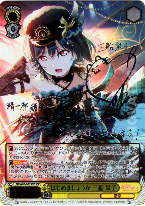 【自】【CXコンボ】 あなたのアンコールステップの始めに、クライマックス置場に「突然の訪問者 三船 栞子」があり、前列にこのカードがいて、他のあなたの《音楽》のキャラが2枚以上で、このカードの正面のキャラがいないか【リバース】しているなら、あなたは自分の控え室のキャラを1枚選び、手札に戻してよい。