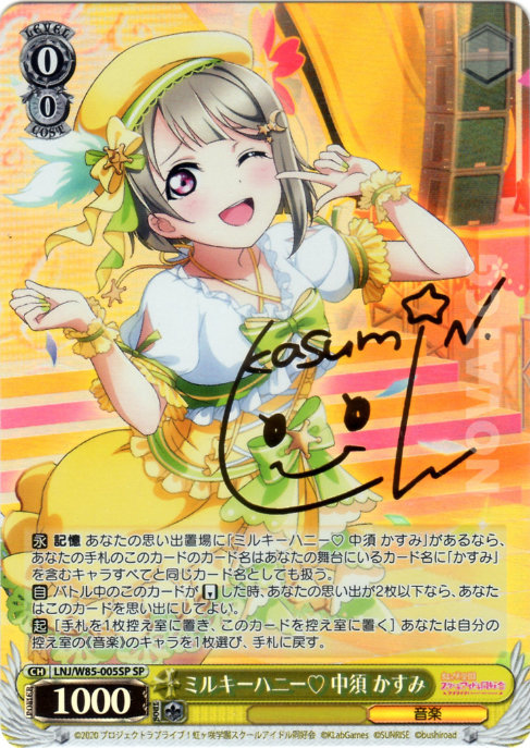 【永】 記憶 あなたの思い出置場に「ミルキーハニー♡ 中須 かすみ」があるなら、あなたの手札のこのカードのカード名はあなたの舞台にいるカード名に「かすみ」を含むキャラすべてと同じカード名としても扱う。