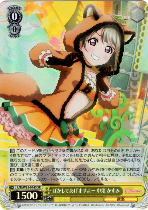 【自】 共鳴 [手札の「ばかしてあげますよー 中須 かすみ」を1枚公開する] あなたのクライマックスフェイズの始めに、あなたはコストを払ってよい。そうしたら、そのターン中、このカードのパワーを+2000し、ソウルを+1。