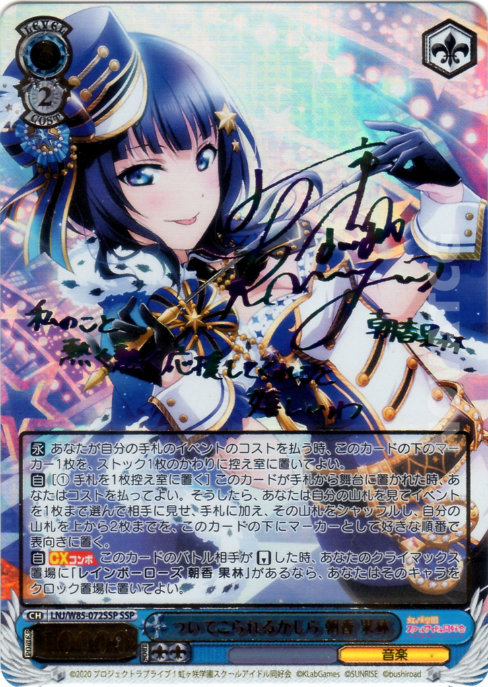 【自】【CXコンボ】 このカードのバトル相手が【リバース】した時、あなたのクライマックス置場に「レインボーローズ 朝香 果林」があるなら、あなたはそのキャラをクロック置場に置いてよい。