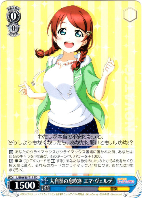 【自】 あなたのクライマックスがクライマックス置場に置かれた時、あなたは自分のキャラを1枚選び、そのターン中、パワーを+1000。
