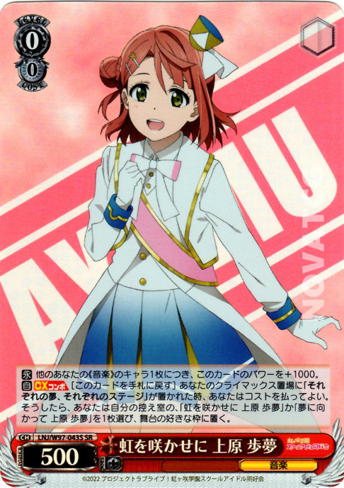 [A] – CX COMBO [Return this card to Hand] When [それぞれの夢, それぞれのステージ] is placed in your Climax Zone, you may pay the cost. If you did, choose one [虹を咲かせに 上原 歩夢] or [夢に向かって 上原 歩夢] in your Waiting Room, place it on Stage in any slot.