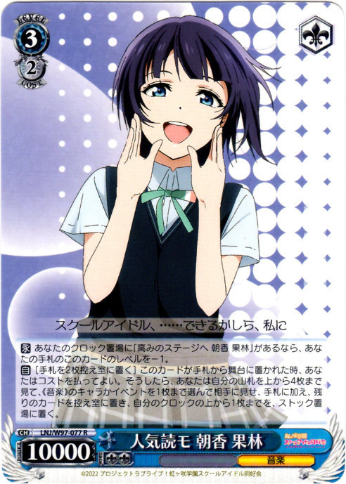 【永】 あなたのクロック置場に「高みのステージへ 朝香 果林」があるなら、あなたの手札のこのカードのレベルを-1。
