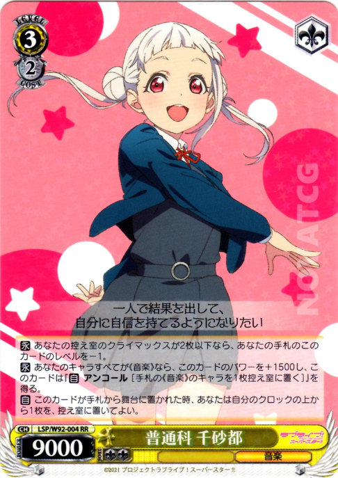 【永】 あなたのキャラすべてが《音楽》なら、このカードのパワーを+1500し、このカードは『【自】 アンコール [手札の《音楽》のキャラを1枚控え室に置く]』を得る。