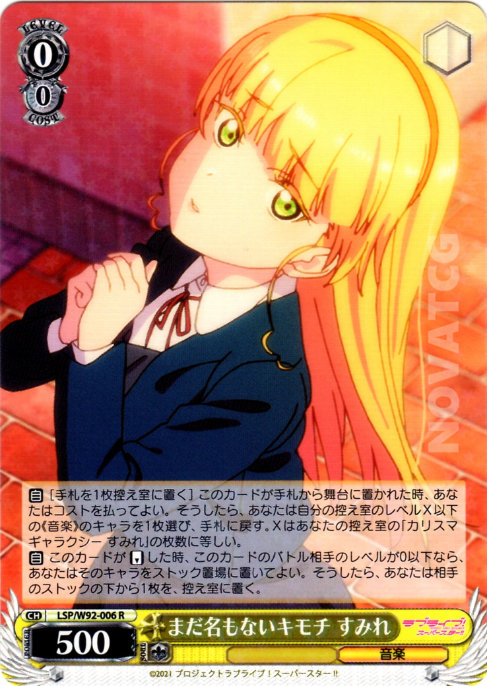 [A] – [Send one card from Hand to Waiting Room] When this card is placed on Stage from Hand, you may pay the cost. If you did, choose up to one Level X or lower «Music» Character in your Waiting Room, add it to Hand. X is the number of [カリスマギャラクシー すみれ] in your Waiting Room.