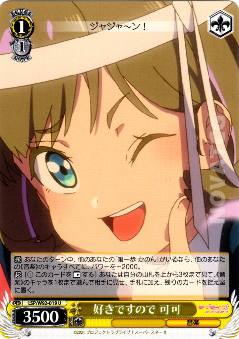 【永】 あなたのターン中、他のあなたの「第一歩 かのん」がいるなら、他のあなたの《音楽》のキャラすべてに、パワーを+2000。