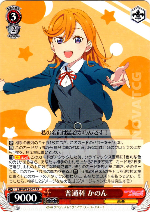 [A] – CX COMBO When this card attacks, if you have [色んな色の光] in your Climax Zone, look at up to two cards from the top of your opponent’s Deck two cards among them, put them on top of opponent’s Deck in any order, send the remaining cards to Waiting Room, during this turn this card gains the following effect: