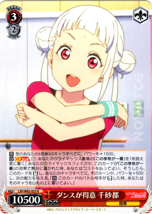 【自】【CXコンボ】[(1) あなたのクライマックス置場の「この学校が一番」を1枚控え室に置く] あなたのクライマックスフェイズ中、このカードが「この学校が一番」の効果で舞台に置かれた時、あなたはコストを払ってよい。そうしたら、このカードを【スタンド】し、あなたのキャラすべてに、そのターン中、パワーを+500し、次の能力を与える。『【自】 このカードのバトル相手が【リバース】した時、あなたはそのキャラを山札の上に置いてよい。』