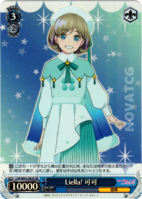 【自】 このカードが手札から舞台に置かれた時、あなたは相手の控え室のカードを3枚まで選び、山札に戻し、相手はその山札をシャッフルする。