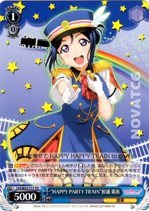【自】【CXコンボ】 このカードのバトル相手が【リバース】した時、あなたのクライマックス置場に「HAPPY PARTY TRAIN」があるなら、あなたは自分の山札を見て《音楽》のキャラを1枚まで選んで相手に見せ、手札に加え、その山札をシャッフルする。