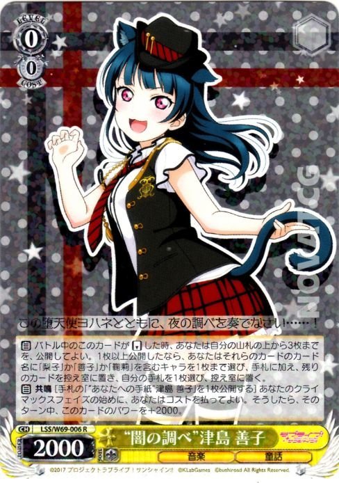 【自】 共鳴 [手札の「“あなたへの手紙”津島 善子」を1枚公開する] あなたのクライマックスフェイズの始めに、あなたはコストを払ってよい。そうしたら、そのターン中、このカードのパワーを+2000。