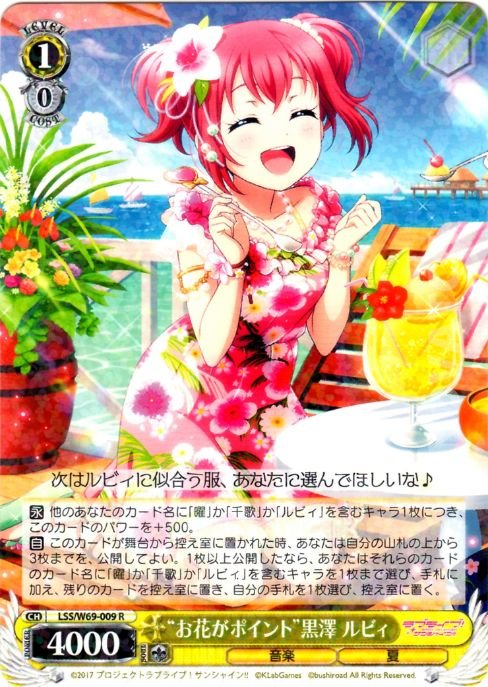 【永】 他のあなたのカード名に「曜」か「千歌」か「ルビィ」を含むキャラ1枚につき、このカードのパワーを+500。