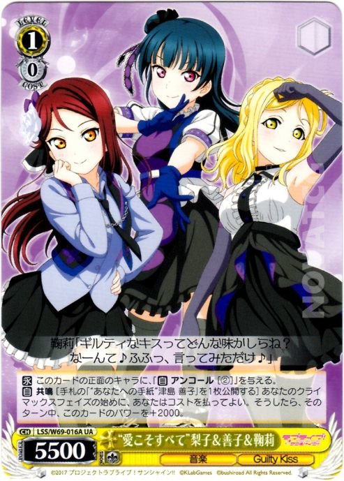 【自】 共鳴 [手札の「“あなたへの手紙”津島 善子」を1枚公開する] あなたのクライマックスフェイズの始めに、あなたはコストを払ってよい。そうしたら、そのターン中、このカードのパワーを+2000。