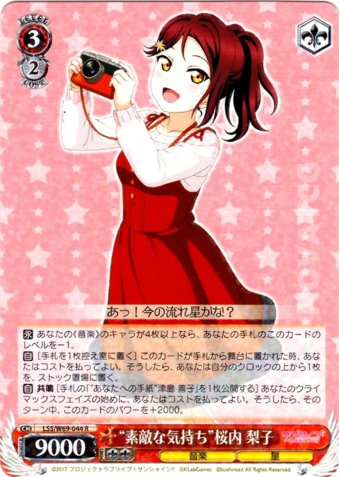 【自】 共鳴 [手札の「“あなたへの手紙”津島 善子」を1枚公開する] あなたのクライマックスフェイズの始めに、あなたはコストを払ってよい。そうしたら、そのターン中、このカードのパワーを+2000。