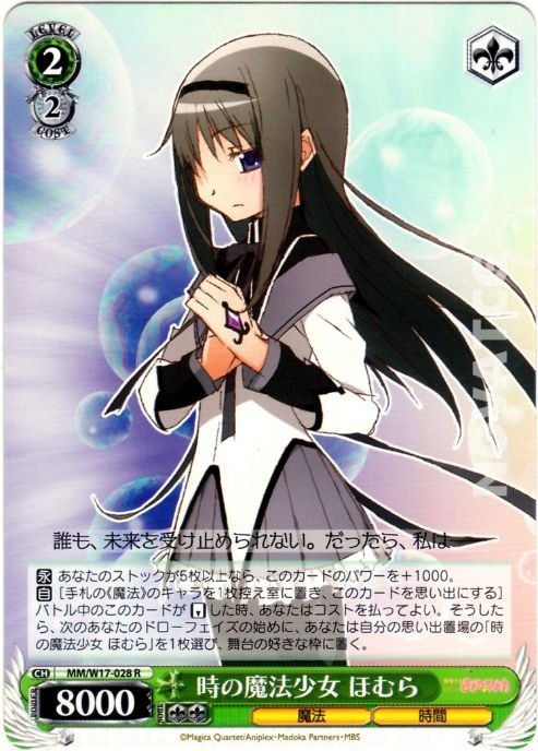 【自】[手札の《魔法》のキャラを1枚控え室に置き、このカードを思い出にする] バトル中のこのカードが【リバース】した時、あなたはコストを払ってよい。そうしたら、次のあなたのドローフェイズの始めに、あなたは自分の思い出置場の「時の魔法少女 ほむら」を1枚選び、舞台の好きな枠に置く。