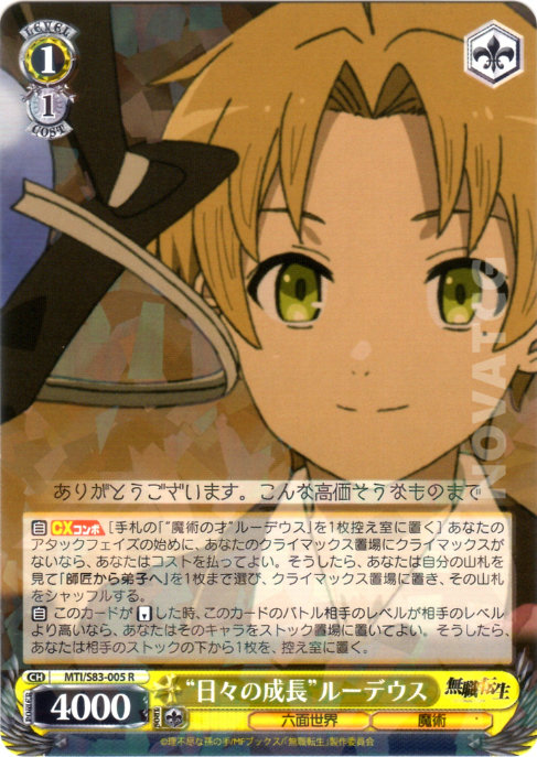 [A] – CX COMBO [Place one [“魔術の才”ルーデウス] from Hand into Waiting Room] A the beginning of your Attack Phase, if you have no Climax in your Climax Zone, you may pay the cost. If you did,search your Deck for up to one [師匠から弟子へ], place it into your Climax Zone, shuffle your Deck afterwards.