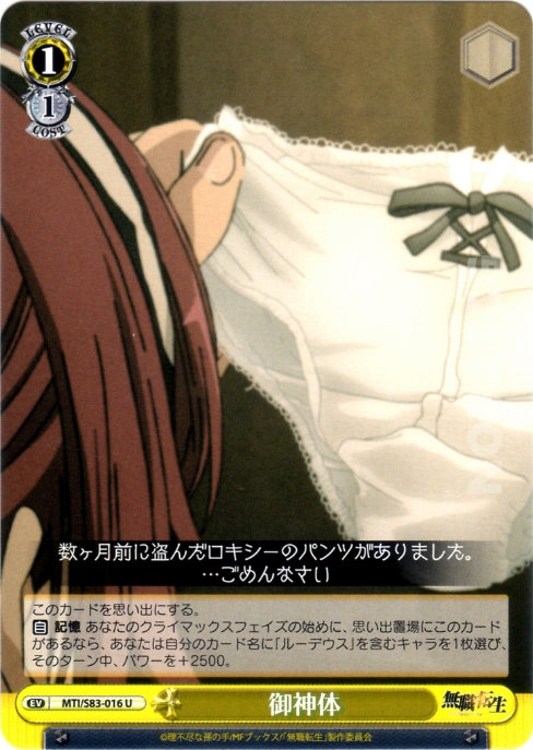 【自】 記憶 あなたのクライマックスフェイズの始めに、思い出置場にこのカードがあるなら、あなたは自分のカード名に「ルーデウス」を含むキャラを1枚選び、そのターン中、パワーを+2500。
