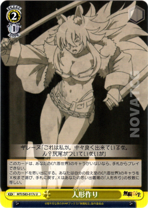 このカードを思い出にする。あなたは自分の控え室の《六面世界》のキャラをX枚まで選び、手札に戻す。Xはあなたの思い出置場の「人形作り」の枚数に等しい。