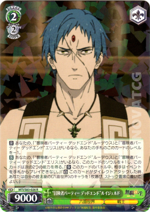 【永】 あなたの、「“冒険者パーティー デッドエンド”ルーデウス」と「“冒険者パーティー デッドエンド”エリス」がいるなら、このカードのソウルを+1し、このカードは次の2つの能力を得る。『【永】 このカードのバトル中、相手はイベントを手札からプレイできない。』『【自】 このカードがダイレクトアタックした時、あなたは自分の控え室の《六面世界》のキャラを1枚選び、ストック置場に置いてよい。』