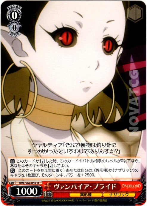 【起】[このカードを控え室に置く] あなたは自分の、《異形種》か《ナザリック》のキャラを1枚選び、そのターン中、パワーを+2500。