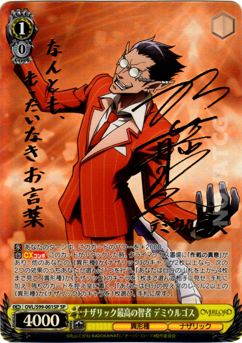 【自】【CXコンボ】 このカードがアタックした時、クライマックス置場に「作戦の真意」があり、他のあなたの、《異形種》か《ナザリック》のキャラが2枚以上なら、次の2つの効果のうちあなたが選んだ1つを行う。『あなたは自分の山札を上から4枚まで見て、《異形種》か《ナザリック》のキャラを1枚まで選んで相手に見せ、手札に加え、残りのカードを控え室に置く。』『あなたは自分の控え室のレベル2以上の、《異形種》か《ナザリック》のキャラを1枚選び、手札に戻す。』
