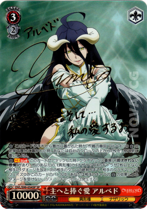 [A] – CX COMBO When this card attacks, if you have [抑えきれない感情] in your Climax Zone, if you have two or more other《Heteromorphic》or《Nazarick》Characters, deal one damage to your opponent, until end of opponent’s next turn, during opponent’s Climax Phase or during this card’s battle, you do not take damage from the [A] effects of opponent’s Characters. (Damage can be canceled)