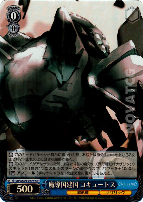 【自】 このカードがアタックした時、あなたは他の自分の、《異形種》か《ナザリック》のキャラを1枚選び、次の相手のターンの終わりまで、パワーを+1000し、『【自】 アンコール [手札のキャラを1枚控え室に置く]』を与える。