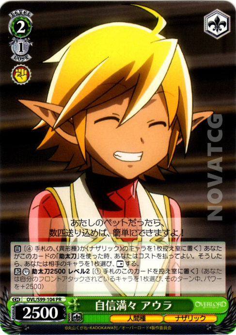 【自】[(4) 手札の、《異形種》か《ナザリック》のキャラを1枚控え室に置く] あなたがこのカードの『助太刀』を使った時、あなたはコストを払ってよい。そうしたら、あなたは相手のキャラを1枚選び、【レスト】する。