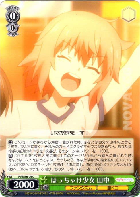 【自】[(1) 手札を1枚控え室に置く] このカードが手札から舞台に置かれた時、あなたはコストを払ってよい。そうしたら、あなたは自分の控え室の、《ファンタズム》か《腹ペコ》のキャラを1枚選び、手札に戻し、他の自分の、《ファンタズム》か《腹ペコ》のキャラを1枚選び、そのターン中、パワーを+1000。