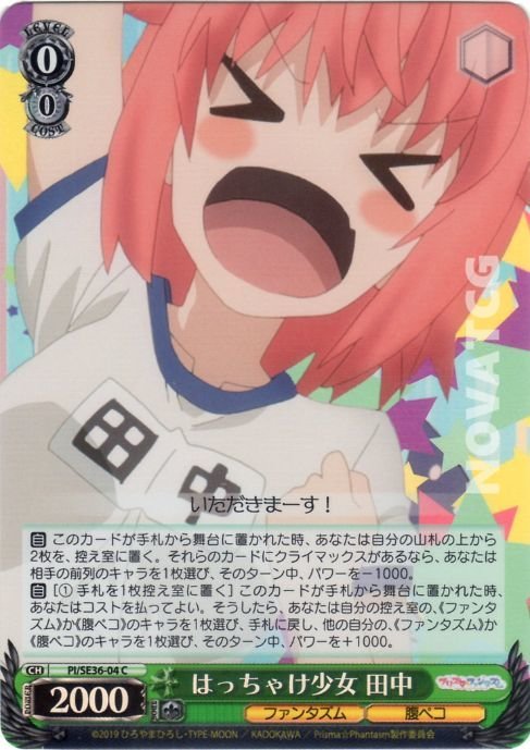 【自】[(1) 手札を1枚控え室に置く] このカードが手札から舞台に置かれた時、あなたはコストを払ってよい。そうしたら、あなたは自分の控え室の、《ファンタズム》か《腹ペコ》のキャラを1枚選び、手札に戻し、他の自分の、《ファンタズム》か《腹ペコ》のキャラを1枚選び、そのターン中、パワーを+1000。