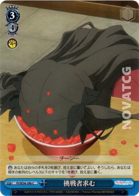【カウンター】 あなたは自分の手札を2枚選び、控え室に置いてよい。そうしたら、あなたは相手の前列のレベル3以下のキャラを1枚選び、控え室に置く。