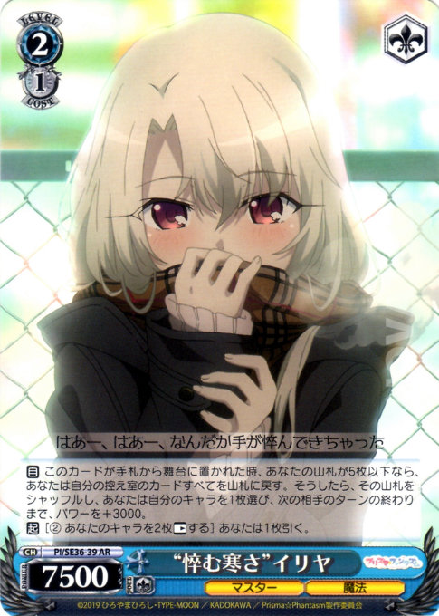 【自】 このカードが手札から舞台に置かれた時、あなたの山札が5枚以下なら、あなたは自分の控え室のカードすべてを山札に戻す。そうしたら、その山札をシャッフルし、あなたは自分のキャラを1枚選び、次の相手のターンの終わりまで、パワーを+3000。