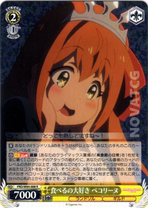 【自】【CXコンボ】 経験 [あなたのクライマックス置場の「美食殿の日常」を1枚控え室に置く] このカードのアタックの終わりに、あなたのレベル置場のカードのレベルの合計が2以上で、他のあなたの《ランドソル》のキャラが4枚以上なら、あなたはコストを払ってよい。そうしたら、あなたは自分の控え室の、「食べるの大好き ペコリーヌ」か「誰かの為に ペコリーヌ」を2枚まで選び、手札に戻し、自分の山札の上から1枚までを、ストック置場に置く。