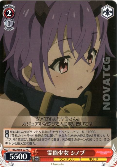 【起】[手札のキャラを1枚控え室に置く] あなたは自分の控え室の「霊能少女 シノブ」を1枚選び、舞台の好きな枠に置き、次の相手のターンの終わりに、そのキャラを控え室に置く。
