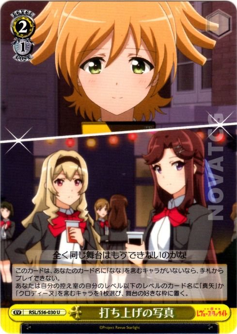 あなたは自分の控え室の自分のレベル以下のレベルのカード名に「真矢」か「クロディーヌ」を含むキャラを1枚選び、舞台の好きな枠に置く。