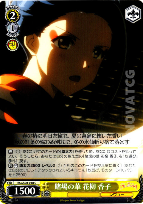 【自】[(1)] あなたがこのカードの『助太刀』を使った時、あなたはコストを払ってよい。そうしたら、あなたは自分の控え室の「賭場の華 花柳 香子」を1枚選び、手札に戻す。