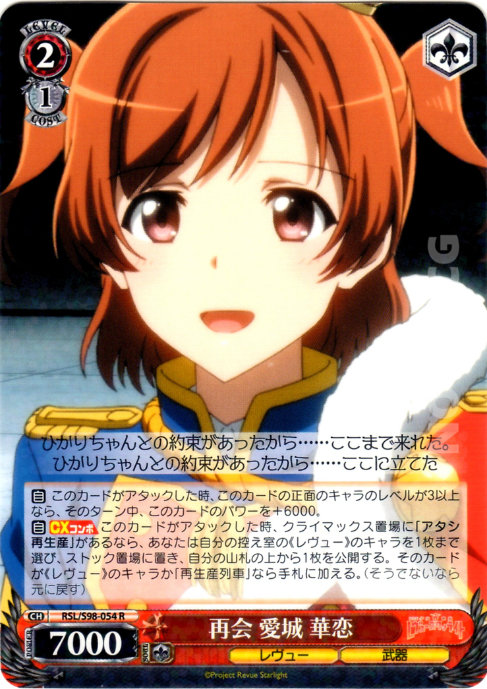 [A] – CX COMBO When this card attacks, if you have [アタシ再生産] in your Climax Zone, choose up to one《Revue》Character in your Waiting Room, send it to Stock, reveal the top card of your Deck. If that card is a《Revue》Character or [3/1 Event], add it to Hand. (If not return revealed card to its original position)