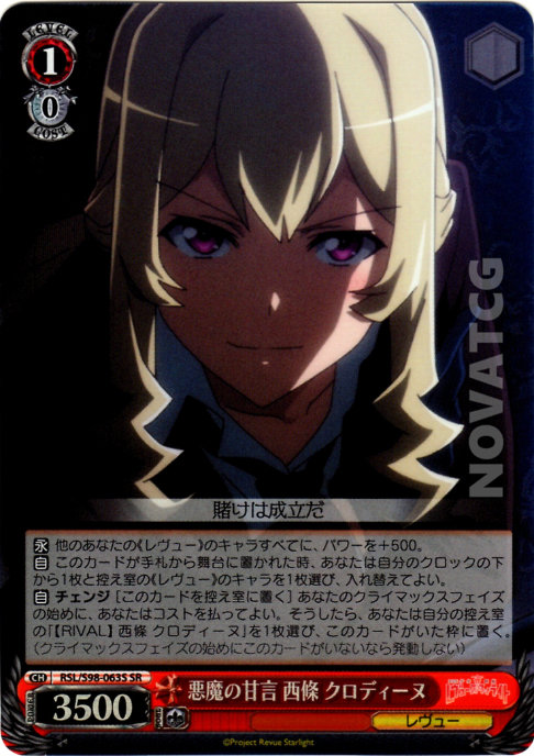 【自】 チェンジ [このカードを控え室に置く] あなたのクライマックスフェイズの始めに、あなたはコストを払ってよい。そうしたら、あなたは自分の控え室の「【RIVAL】 西條 クロディーヌ」を1枚選び、このカードがいた枠に置く。(クライマックスフェイズの始めにこのカードがいないなら発動しない)