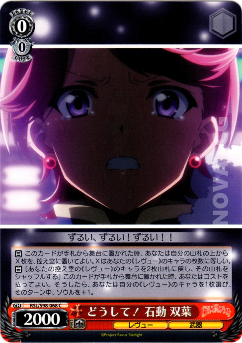 【自】[あなたの控え室の《レヴュー》のキャラを2枚山札に戻し、その山札をシャッフルする] このカードが手札から舞台に置かれた時、あなたはコストを払ってよい。そうしたら、あなたは自分の《レヴュー》のキャラを1枚選び、そのターン中、ソウルを+1。