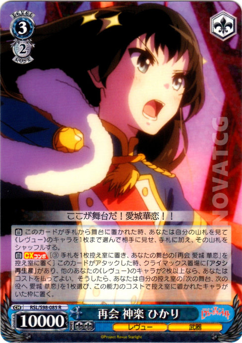 [A] – CX COMBO [(3) Send one card from Hand to Waiting Room, send one [次の舞台, 次の役へ, 愛城 華恋] on your Stage to Waiting Room] When this card attacks, if you have [アタシ再生産] in your Climax Zone, if you have two or more other《Revue》Characters, you may pay the cost. If you did, choose one [次の舞台, 次の役へ, 愛城 華恋] in your Waiting Room, place it in the previous slot of the Character sent to Waiting Room for the cost of this effect.
