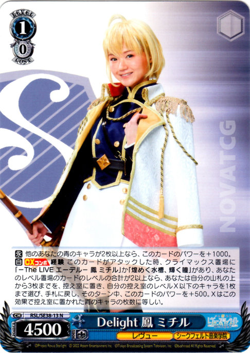 [A] – CX COMBO EXPERIENCE When this card attacks, if you have [-The LIVE エーデル- 鳳 ミチル] in your Climax Zone, if the total Level of cards in your Level Zone is two or higher, you may send up to three cards from the top of your Deck to Waiting Room, choose up to one Level X or lower Character in your Waiting Room, add it to Hand, during this turn, this card gains +500 Power. X is the number of Blue Characters sent to Waiting Room by this effect.