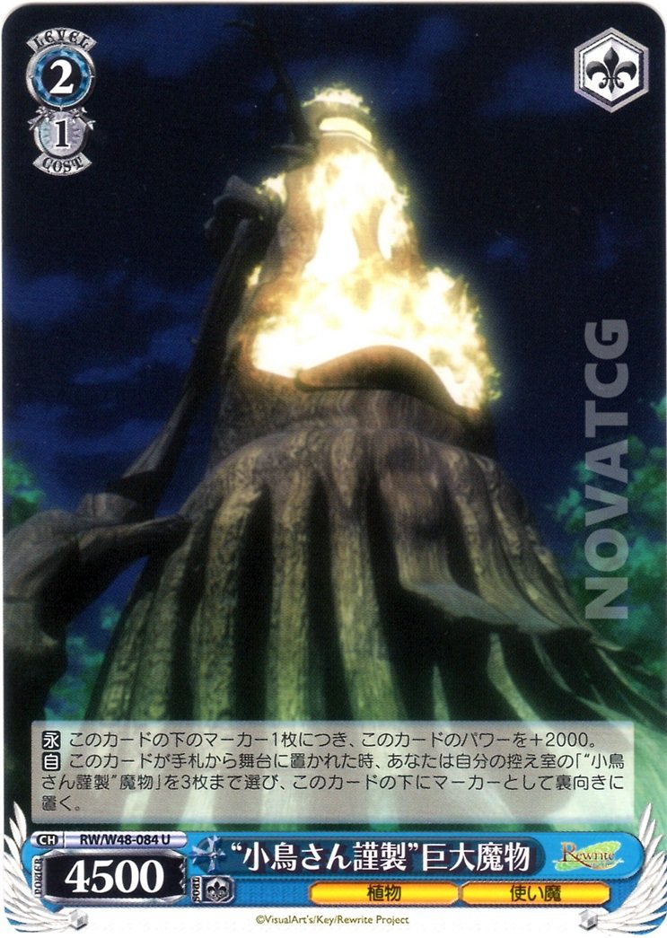 【自】 このカードが手札から舞台に置かれた時、あなたは自分の控え室の「“小鳥さん謹製”魔物」を3枚まで選び、このカードの下にマーカーとして裏向きに置く。