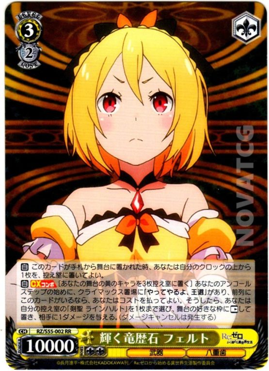 【自】【CXコンボ】[あなたの舞台の黄のキャラを3枚控え室に置く] あなたのアンコールステップの始めに、クライマックス置場に「やってやるよ、王選」があり、前列にこのカードがいるなら、あなたはコストを払ってよい。そうしたら、あなたは自分の控え室の「剣聖 ラインハルト」を1枚まで選び、舞台の好きな枠に【レスト】して置き、相手に1ダメージを与える。(ダメージキャンセルは発生する)