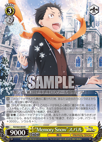 【自】 記憶 このカードがアタックした時、あなたの思い出置場の「雪うさぎ」が4枚以上なら、あなたは自分のキャラを1枚選び、そのターン中、パワーを+3000し、ソウルを+1。
