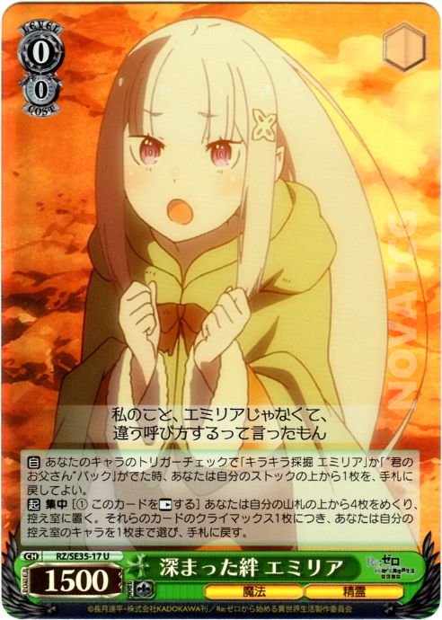 【自】 あなたのキャラのトリガーチェックで「キラキラ採掘 エミリア」か「“君のお父さん”パック」がでた時、あなたは自分のストックの上から1枚を、手札に戻してよい。