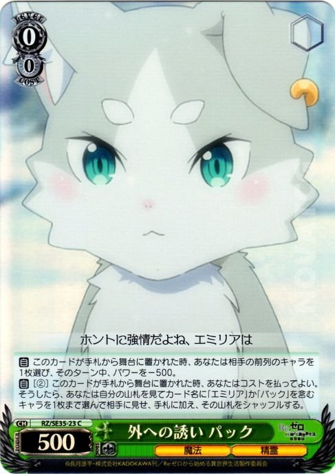 【自】[(2)] このカードが手札から舞台に置かれた時、あなたはコストを払ってよい。そうしたら、あなたは自分の山札を見てカード名に「エミリア」か「パック」を含むキャラを1枚まで選んで相手に見せ、手札に加え、その山札をシャッフルする。