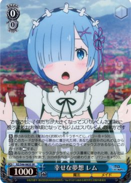 【自】[あなたの山札の上から1枚をクロック置場に置き、手札を1枚控え室に置く] このカードが舞台から控え室に置かれた時、他のあなたのカード名に「ラム」か「スバル」を含むキャラがいるなら、あなたはコストを払ってよい。そうしたら、あなたは自分の控え室の「ささやかなお願い レム」を1枚選び、舞台の好きな枠に【レスト】して置く。